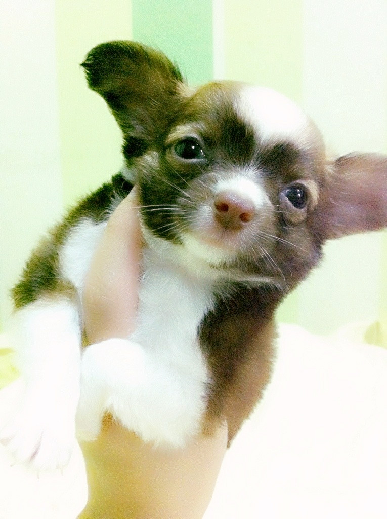 Chihuahuaสีขาวช๊อคโกแลตขนยาวเพศผู้ไซด์จิ๋วบริการจัดส่งคร้าบ
